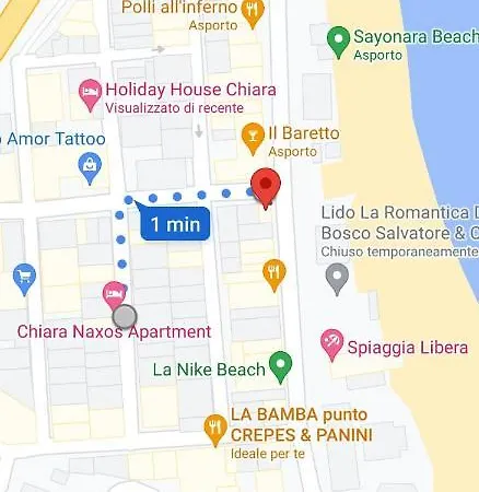 El Chiara Naxos Apartment Giardini-Naxos, goza de una ubicación frente a la playa, a unos 5 minutos andando de Splash Beach Giardini-Naxos. El apartamento de 90 m^2 dispone de Wi-Fi, servicio de cambio de divisas y cajero automático, además de un aparcamiento los huéspedes que viajen en coche.